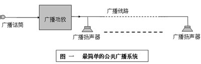 一個公共廣播系統起碼須配置下列環節:廣播揚聲器,廣播功放,話筒。最簡單的系統如圖一所示。