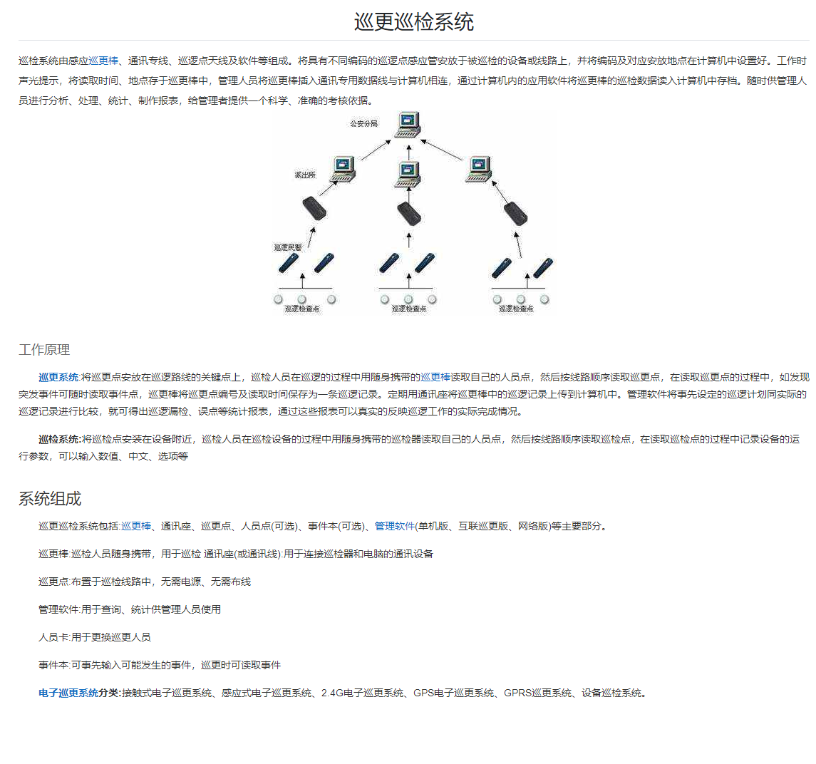 巡更系統包括:巡更棒、通訊座、巡更點、人員點(可選)、事件本(可選)、管理軟件(單機版、局域版、網絡版)等主要部分。