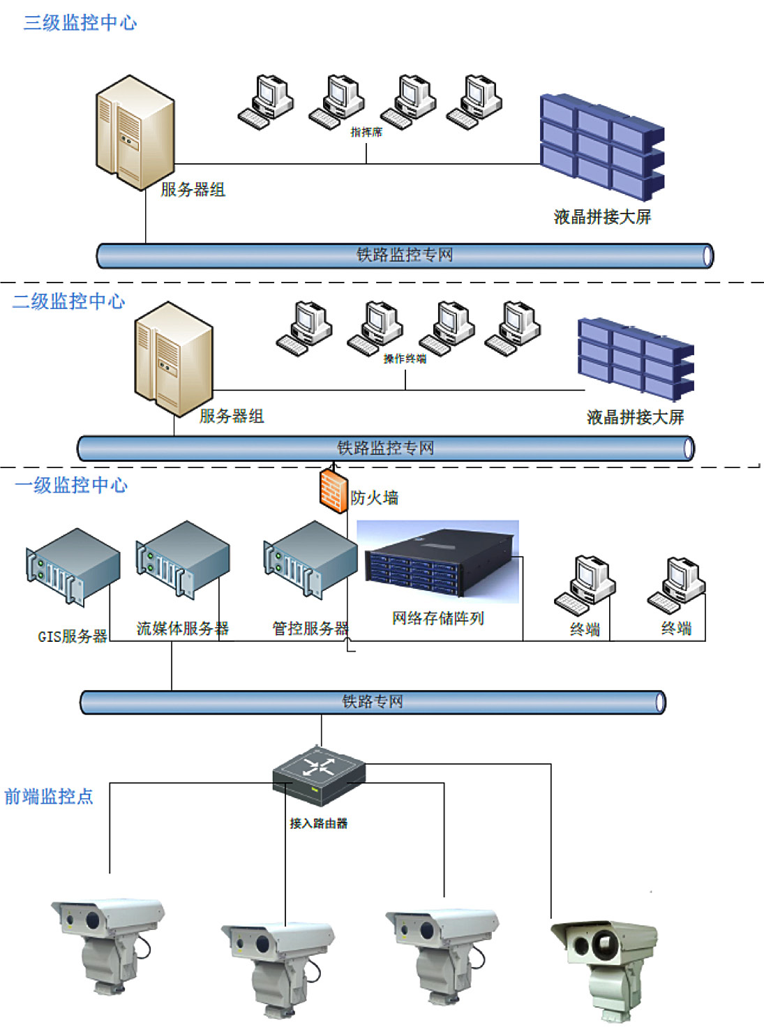 鐵路視頻監控系統主要由三大部分組成:前端圖像采集系統、視頻傳輸系統、后端監控管理指揮系統。該系統滿足本地監控和中心聯網多級網絡化視頻監控的需求。可24小時實時監控鐵路沿線安全情況,降低了安全監控人員的勞動強度,為監控中心指揮提供強有力的保障,使各級監視中心的調度人員通過監視遠端傳送上來的現場圖像,直觀、準確、及時地了解各工區的實際情況。前端圖像采集系統的數據傳輸至各采集站,作業區,廠區監控中心后,視頻解碼器設備還原出視頻信號至數據接收器,即可完成數據的采集,傳輸,匯總。