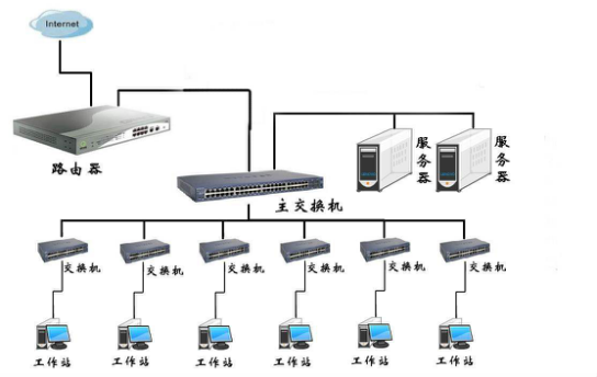 中型局域網(wǎng)可以采用兩層結構,即中心交換機層和供各個節(jié)點連入的桌面交換機層。中心交換機可以采用一臺高檔的企業(yè)級交換機,提供多個千兆網(wǎng)絡端口。各個節(jié)點的桌面交換機連接到中心交換機上,這些桌面交換機內(nèi)部就相當于一個小型局域網(wǎng)。