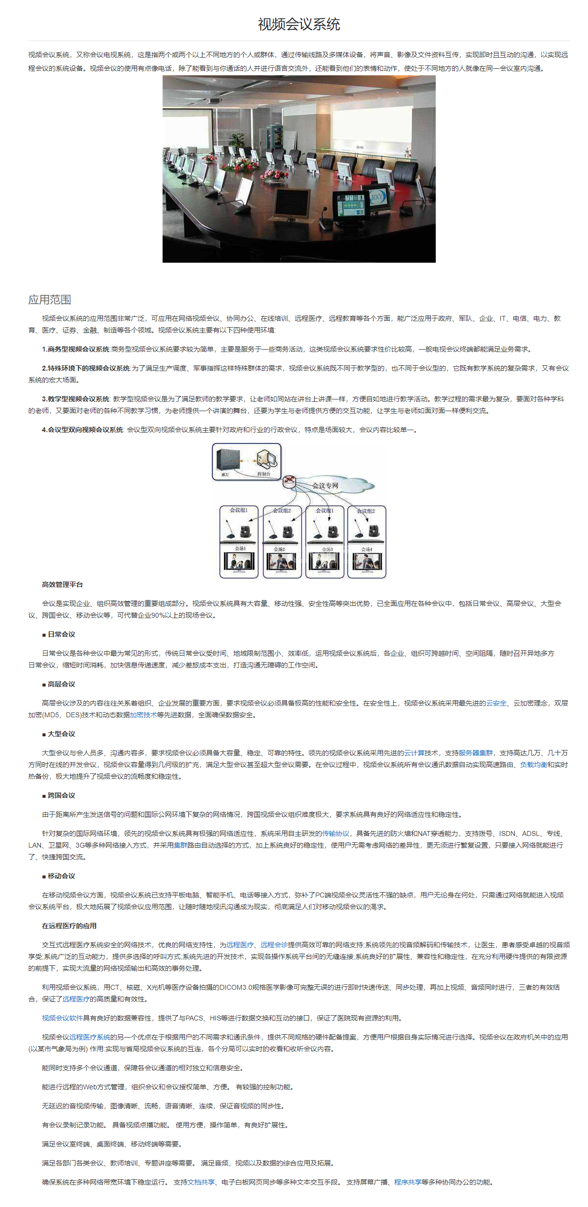 .基本的會議系統,由麥克風、功放、音響、桌面顯示設備(例如桌面智能終端、液晶顯示器),這幾樣設備的組合應用也可以說是一個會議系統了,它們起到了傳聲,顯示,擴聲的作用,達到能看、能聽、能說話。 隨著科技的發展、功能需求的提升,特別是電腦、網絡的普及和應用,會議系統的范疇更大了,包括了表決/選舉/評議、視像、遠程視像、電話會議、同傳會譯、桌面顯示,這些是構成現代會議系統的基本元素,同時衍生了一系列的相關設備,比如中控、溫控制、光源控制、聲音控制、電源控制等等。 現代科技發展的促使下,會議系統定義成是一整套的與會議相關的軟硬件。